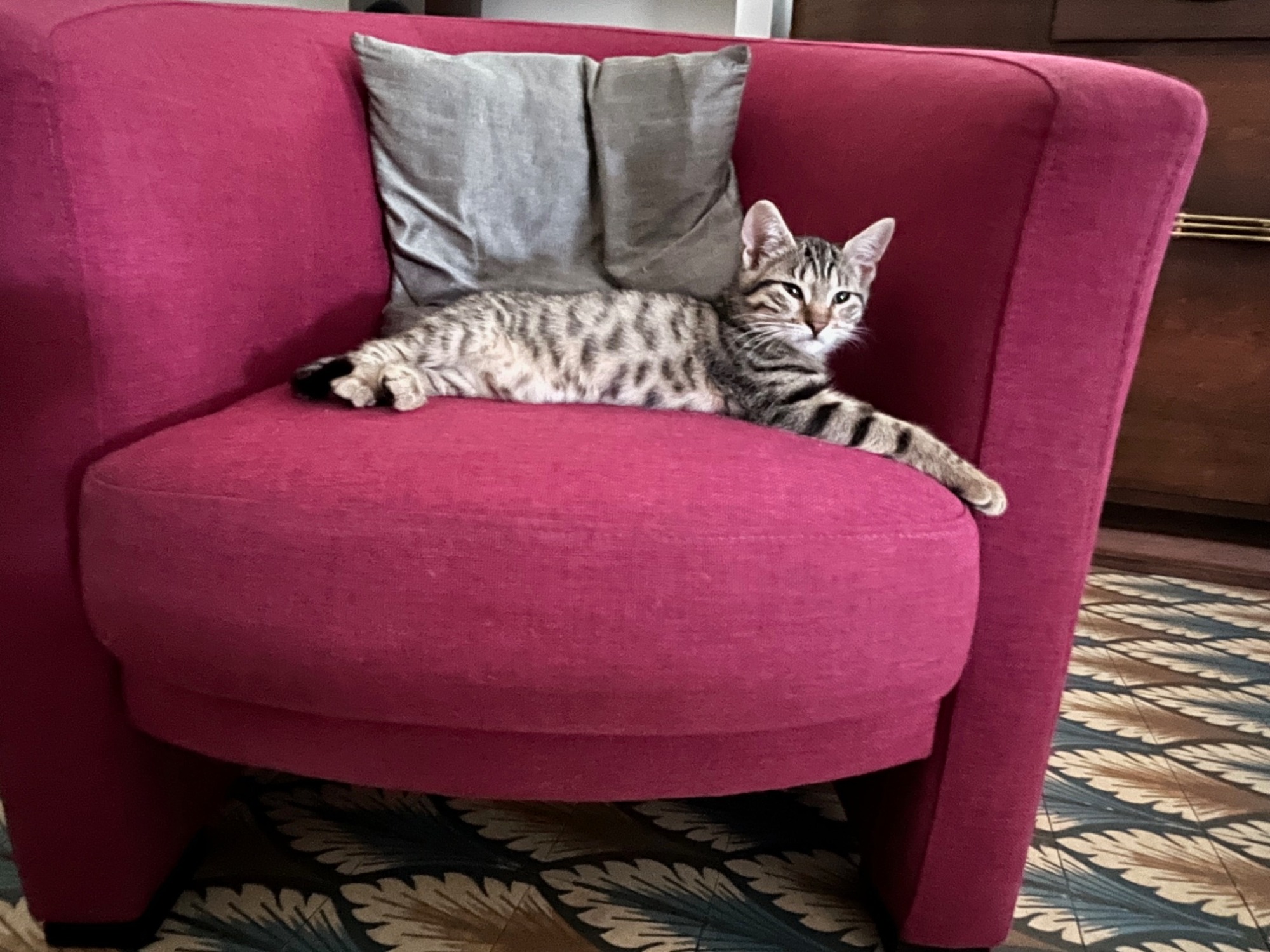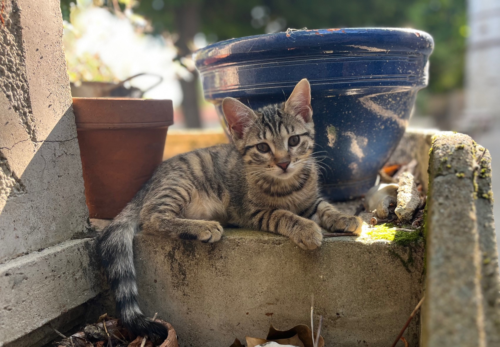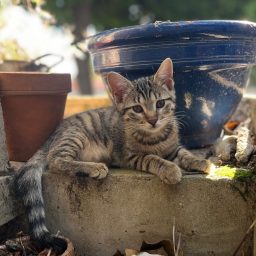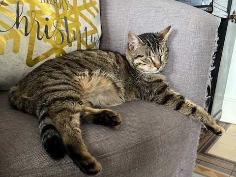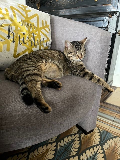 Chatte type européen gris/marron tigrée, Etincelle est âgée de 10 mois. Elle est avec nous depuis ses 3 mois. Très joueuse, elle est en plein apprentissage pour devenir chat médiateur. Elle apprend les règles de vie à notre contact et avec Ardent qui ne l’impressionne pas malgré sa taille.