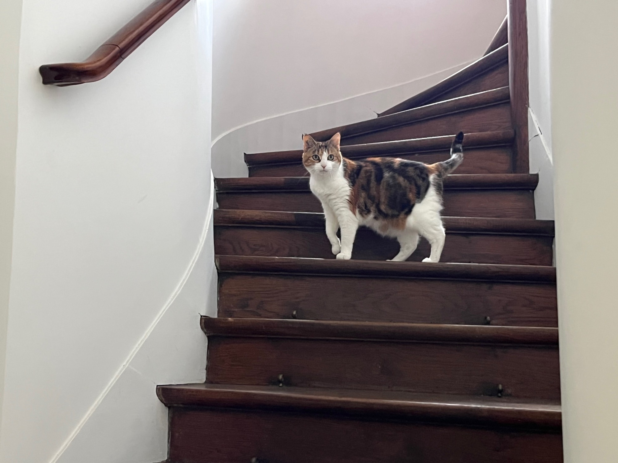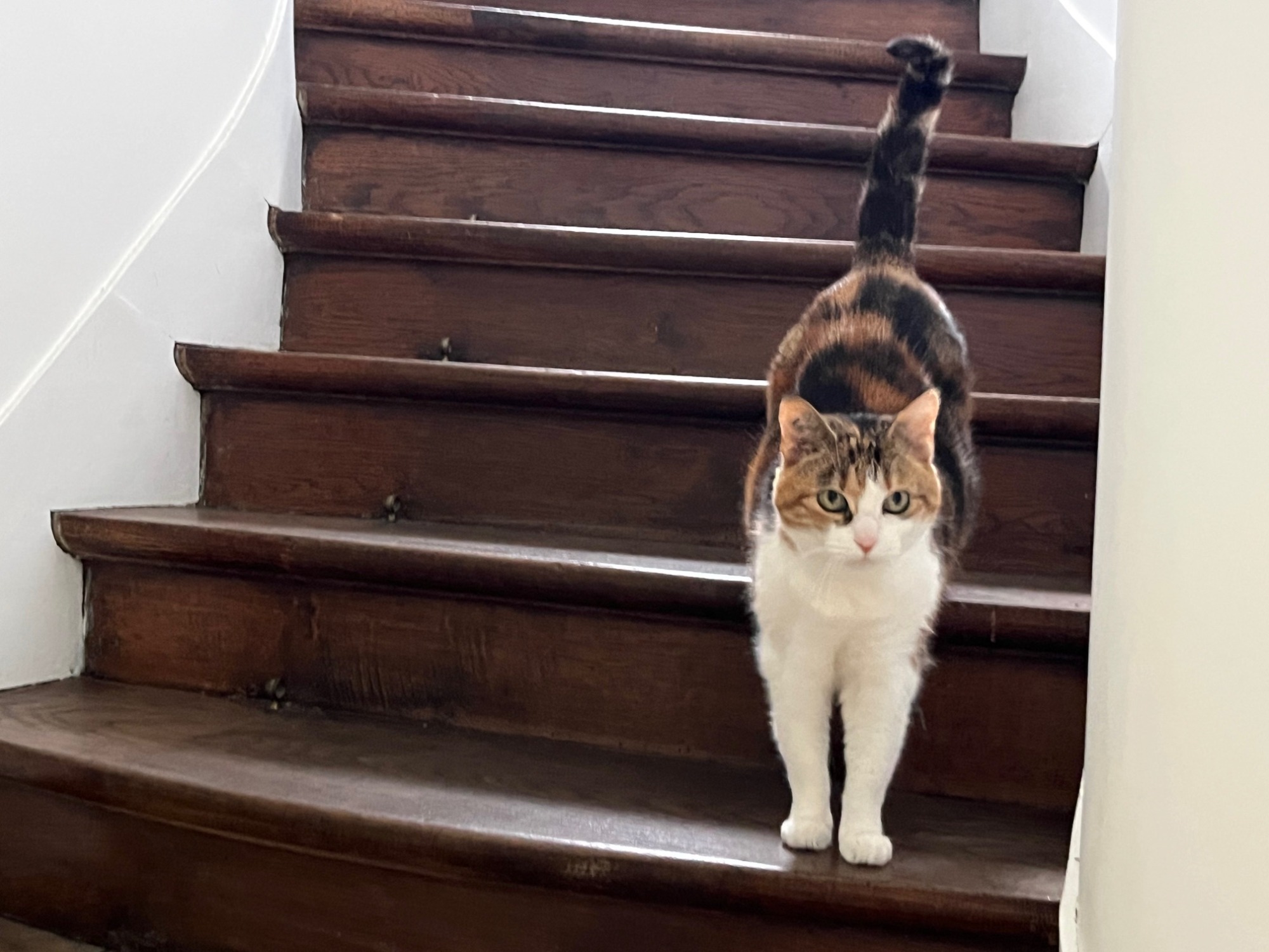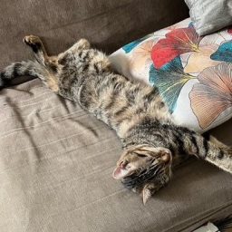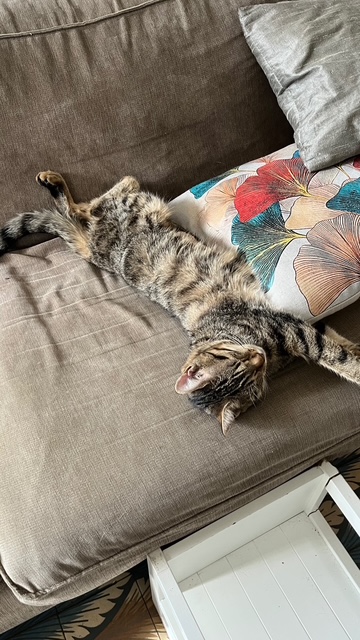 Elle trouve toujours des endroits improbables pour dormir. Très câline et manipulée par des enfants dès sa naissance, elle aime se lover dans les bras et ronronne très fort !